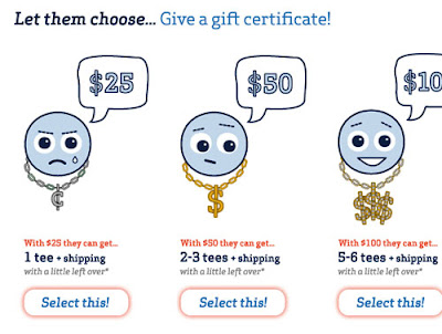 And that’s it. “Let them choose a Threadless tee” represents a far more tangible and real gift than if I had given her a cash-value gift certificate. The next time I see Mary, she thanks me for the awesome shirt she’s proudly wearing.